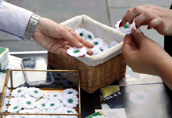 Una flor de hilo tejida a ganchillo, de once pétalos blancos y pistilo verde recuerda a las miles de víctimas de la masacre de Srebrenica. Fuente de la imagen: Heraldo de Aragón | Efe