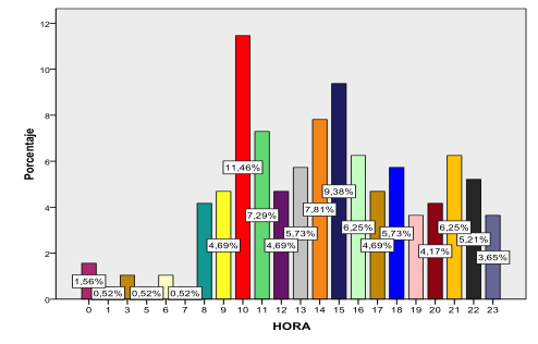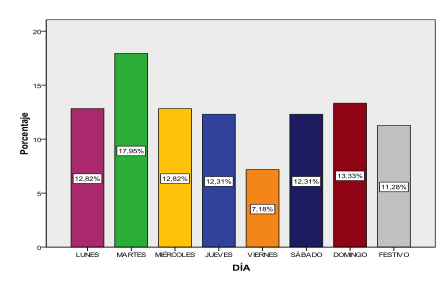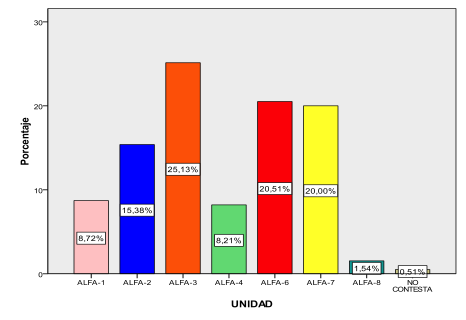 En la figura 1 de participación según bases del SAMU se puede observar que de una muestra de n=195 cuestionarios, sólo un profesional (0,6%) del SAMU no contestó a qué unidad pertenecía, 17 (8,7%) pertenecía a la unidad alfa-1, 30 (15,4%) a la unidad alfa-2, 49 (25,1%) a la unidad alfa-3, siendo la unidad con mayor número de profesionales que han participado en el análisis, 16 (8,2%) a la unidad alfa-4, 40 (20,5%) a la unidad alfa-6, 39 (20%) a la unidad alfa-7 y 3 (1,5%) a la unidad alfa-8. En la figura 2 de distribución diaria de las emergencias sociales, de un total de 195 emergencias, se atendieron 35 (17,9%) emergencias sociales en el martes siendo este día la moda de la distribución por tener la máxima frecuencia. En el resto de días se observa una distribución bastante similar (del 11.28% al 13.33%) a excepción del viernes (7.18%). En la figura 3 de distribución horaria de las emergencias sociales se puede ver que el 54,7% de las emergencias han tenido lugar entre las 9 y las 16 horas (horario en el que el SAUS no se encuentra operativo), siendo el rango de las 10 de la mañana el que más activaciones presenta con un total de 22 (11,3%). El SAMU recibe los avisos de emergencia por el CICU, y éste por del 112. El equipo SAMU está integrado por médico, enfermero y técnico en emergencias. La enfermera realiza cuidados de enfermería específicos en emergencias extrahospitalarias y entre sus funciones está la valoración de necesidades psicosociales. Según la entrevistas 1 y 2, el SAMU detecta situaciones de riesgo y necesidades sociales sujetas a seguimiento, valoración y detección, requiriendo una atención por un servicio específico de intervención ante las emergencias sociales. Los profesionales sanitarios no disponen de competencias específicas de intervención ante necesidades psicosociales. Se constata en las siguientes citas:- Mucho, pero también se genera… Yo atiendo un intento de autolisis, por ejemplo; me llevo al paciente vivo, tengo que trabajar con él como una atención médica, sanitaria, pero qué hago con la familia, qué hago con esa madre, ¿necesita otro recurso? Porque tendrá una crisis de ansiedad y al final me va a derivar en una emergencia por lo menos una urgencia; necesita una atención de alguien que haga que no vaya a más, alguien que sepa dónde dirigirlo, alguien que diga ahora qué hago (Entrevista 1).