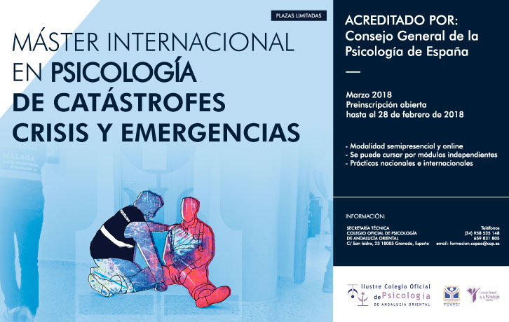 El Colegio Oficial de Psicología de Andalucía Oriental, consciente de la importancia que está adquiriendo la psicología de emergencias y la demanda de este tipo de formación, está organizando un Máster internacional en PSICOLOGÍA DE CATÁSTROFES, CRISIS Y EMERGENCIAS, previsto para marzo de 2018.