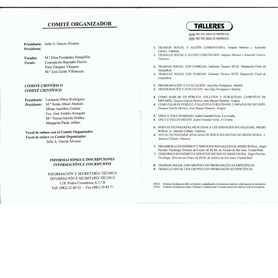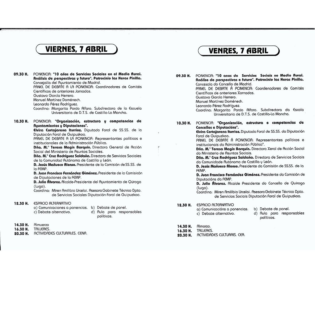 EL comité científico de estas jornadas realizaba un análisis del contexto y situación de partida de los servicios sociales. En este análisis profundizaba sobre la aprobación de la constitución y el proceso de democratización, la creación de las comunidades autónomas, la aparición del Plan Concertado y la incorporación de España a las Comunidades Europeas e inicio de la Unión. En definitiva, la historia de nuestro país. El precio de las inscripciones en estas jornadas estaba en pesetas, aún faltarían unos años hasta que pasáramos al euro.