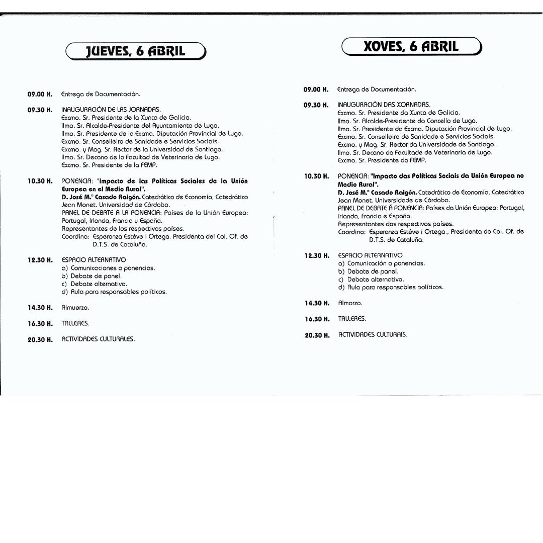 Estas jornadas se celebraron con la colaboración del Colegio Oficial de Trabajo Social de Galicia. La finalidad era la de facilitar a los Trabajadores y Trabajadoras Sociales un espacio para el análisis, la reflexión y el debate sobre las necesidades de la población rural y el trabajo social que se desarrolla, para sistematizar las experiencias y evaluar la adecuación de los recursos a las necesidades.