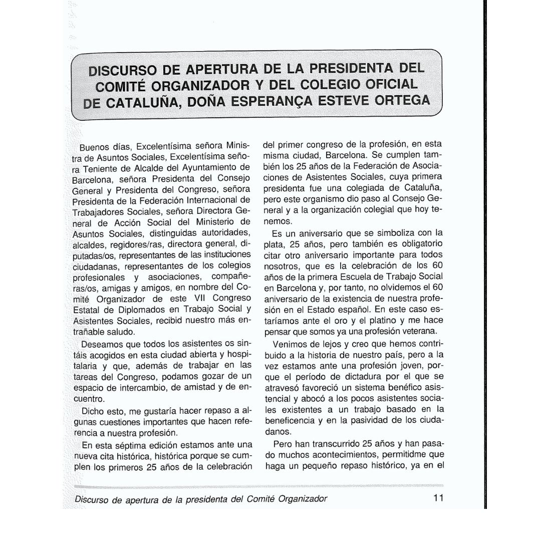 En 1998 se cumplieron 25 años desde la celebración del primer congreso. La presidenta del comité organizador y del Colegio Oficial de Cataluña, doña Esperança Esteve Ortega, cerraba el discurso de apertura con las siguientes palabras. “25 años de experiencia nos avalan” , haciendo ya referencia al Trabajo Social como una profesión veterana. Sigamos sumando años. Nos vemos el próximo 25, 26 y 27 de mayo en Ciudad Real en el XIV Congreso Estatal y II Iberoamericano de Trabajo Social.